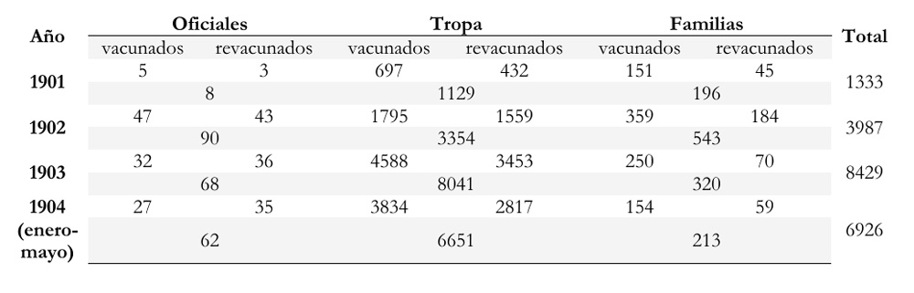 Para los años 1901-1904 disponemos de información sobre la cantidad de vacunados y revacunados en el Ejército incluyendo oficiales, suboficiales y sus familias (Tabla 1). Estos datos permiten registrar un significativo incremento interanual de las aplicaciones de vacunas, una cobertura de alrededor del 50% de la tropa en 1903 y un potencial aumento porcentual de la vacunación/revacunación en la tropa para el año 1904 (del cual sólo tenemos datos entre enero y mayo).[36]