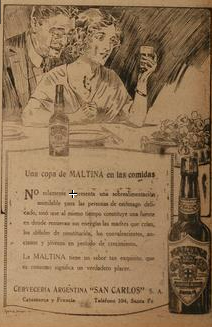 Una copa de Maltina en las comidas. No solamente representa una sobrealimentación asimilable para las personas de estómago delicado, sino que al mismo tiempo constituye una fuente donde renuevan sus energías las madres que crían, los débiles de constitución, los convalecientes, ancianos y jóvenes en período de crecimiento.[11]