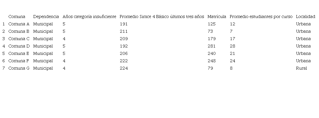 Para determinar las escuelas básicas en la situación más crítica, se establecieron los siguientes criterios: un primer gran criterio fue situarse en categoría insuficiente según los últimos informes elaborados por la Agencia de Calidad (año 2018). En algunas comunas (n=7) no existían establecimientos básicos en categoría insuficiente; por lo tanto, se excluyeron del estudio. Con el fin de apostar por un criterio de diversidad territorial y variabilidad de los participantes (Creswell, 2014) se seleccionó una escuela por comuna. En el caso de que en algunas comunas (n=4) existiera más de una escuela en categoría insuficiente, se establecieron los siguientes criterios: a) número de años consecutivos en la categoría, b) resultados SIMCE en cuatro básico (últimos tres años), c) descenso matrícula (últimos tres años) y, d) contacto con sostenedores para determinar la escuela en la situación de insuficiencia más crítica. Con base en estos criterios, se identificaron ocho escuelas básicas como las “más críticas” en ocho comunas diferentes. Luego, se contactaron vía correo electrónico a cada uno de los directores para concertar una entrevista. Solo una persona directora se negó a participar del estudio. Todos los participantes firmaron un consentimiento informado, asegurando anonimato y confidencialidad. Por lo mismo, se utilizan seudónimos en el nombre de las comunas y también de los participantes. Tabla 1