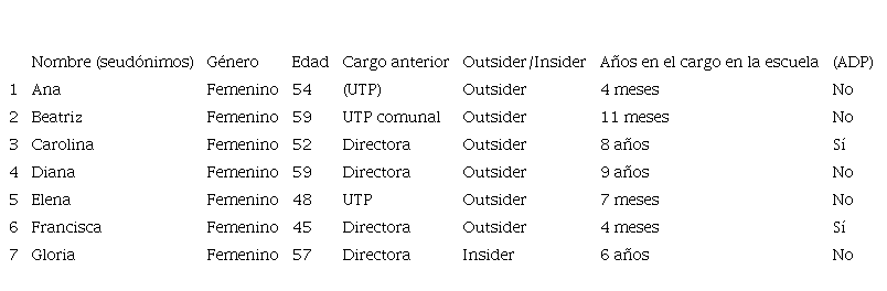 Las personas directoras de este estudio son todas del género femenino; por lo tanto, se comentará de ellas como “directoras” y se utilizarán nombres ficticios para referirse a ellas. El promedio de edad corresponde a 53 años. Tres de ellas se encuentran prontas a jubilarse, en tanto las otras son directoras noveles (menos de tres años de experiencia directiva). En su mayoría, el cargo previo corresponde a directora o jefa de unidad técnica pedagógica (UTP) a nivel escolar o comunal.