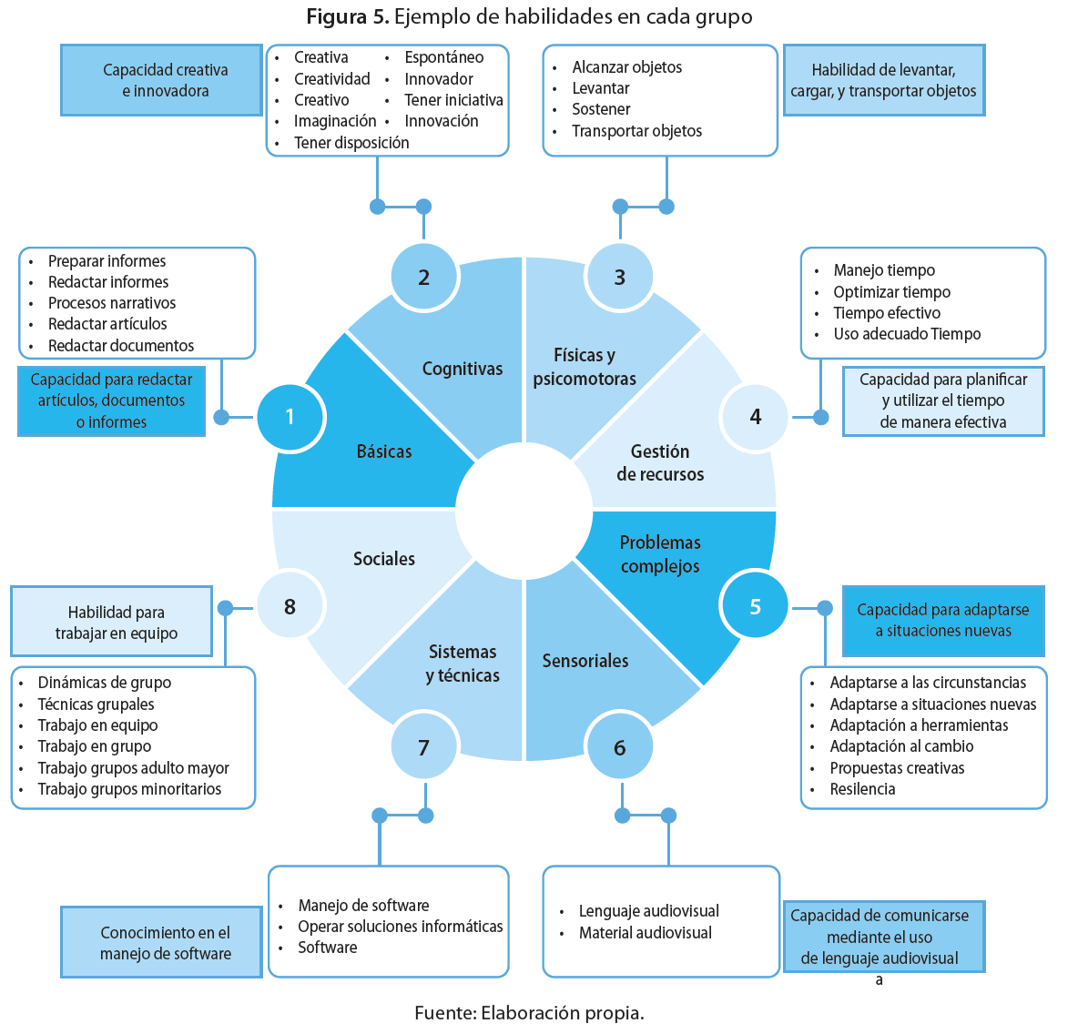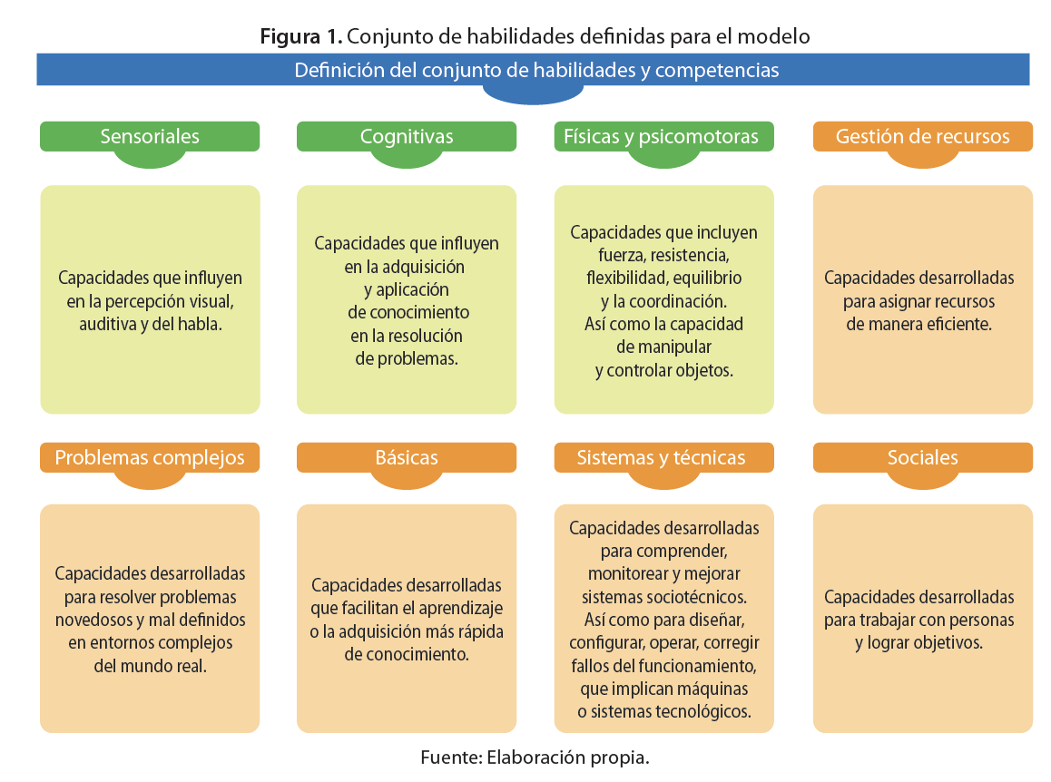 Por ese motivo, se definen ocho grupos de habilidades y competencias, específicamente las sensoriales, cognitivas, físicas y psicomotoras corresponden a habilidades y, los restantes grupos a competencias integradas por problemas complejos, sociales, sistemas y técnicas, básicas y gestión de recursos. La figura 1 presenta las definiciones para cada uno de los grupos descritos anteriormente.