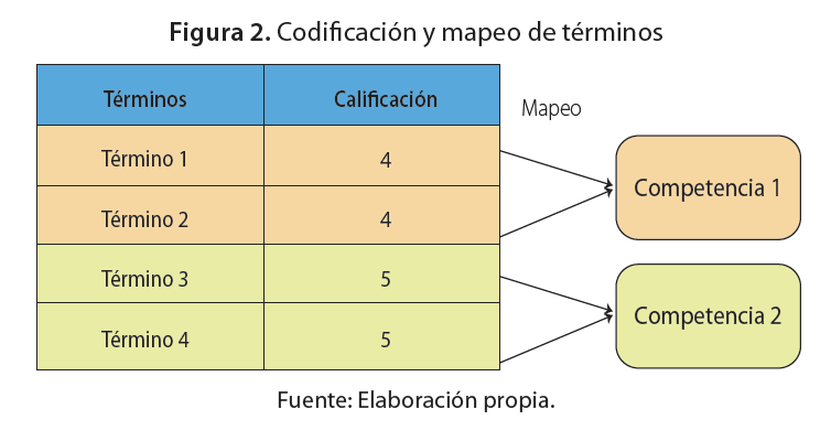 2. El mapeo, con el propósito de asociar cada elemento de la codificación con una competencia y/o habilidad, estas se asociaron al diccionario de palabras para que posteriormente, la herramienta Decoder, lograra mapearla de manera automática. La figura 2 ejemplifica el proceso de agrupación que se realizó con los términos del diccionario.