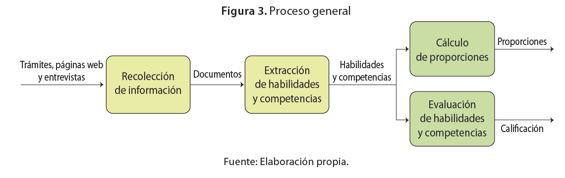 El primer proceso, considera la etapa de la recolección de información, donde se utilizaron técnicas como web scraping para extracción de texto de sitios web, análisis de imágenes para extracción de texto de archivos en formato pdf que se encontraban protegidos o escaneados y procesamiento de la base de datos de la encuesta de habilidades para industria 4.0.