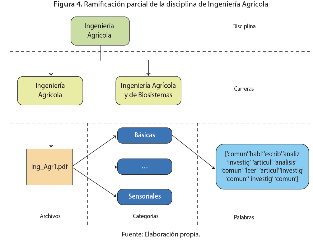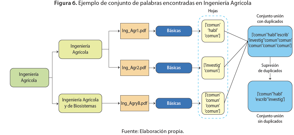 A continuación, considerando la cantidad de información recolectada, se da inicio al análisis de texto por medio del algoritmo de Caribdis, cuya principal función es la agrupación de prefijos habilidades, según los datos disponibles por disciplina. La figura 6 ejemplifica la funcionalidad de dicho algoritmo. En dicho ejemplo, el nodo de “Ingeniería Agrícola” corresponde a la disciplina, que está integrada por las carreras “Ingeniería Agrícola” e “Ingeniería Agrícola y Biosistemas”. Cada una de las carreras cuenta con información en pdf. La carrera “Ingeniería Agrícola” incluye dos fuentes de información, mientras que la carrera de “Ingeniería Agrícola y Biosistemas”, contiene únicamente una fuente. A partir de este punto, los nodos señalados como hojas, contienen los prefijos de palabras por grupo de habilidad, que particularmente para este ejemplo, se muestra solamente la agrupación de Básicas. Se procede entonces, a realizar la unión de dichos términos, para culminar con la eliminación de duplicados, dejando finalmente un único conjunto de términos sin repeticiones, que representa a las habilidades básicas encontradas para la disciplina de Ingeniería Agrícola.