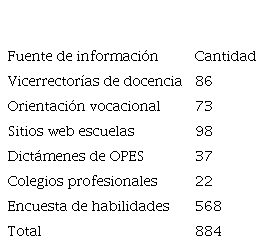 El acervo construido cuenta con un total de 316 documentos en diferentes formatos, (pdf, txt o html). Dicha información se resume en el cuadro 1, en el cual, las fuentes de información principales corresponden a los sitios web de las escuelas y las vicerrectorías de docencia de las cinco universidades estatales, reflejando de esta manera, la colaboración interinstitucional; asimismo, las oficinas de orientación vocacional de las universidades, por su naturaleza y razón de ser, cuentan con información completa de las carreras.