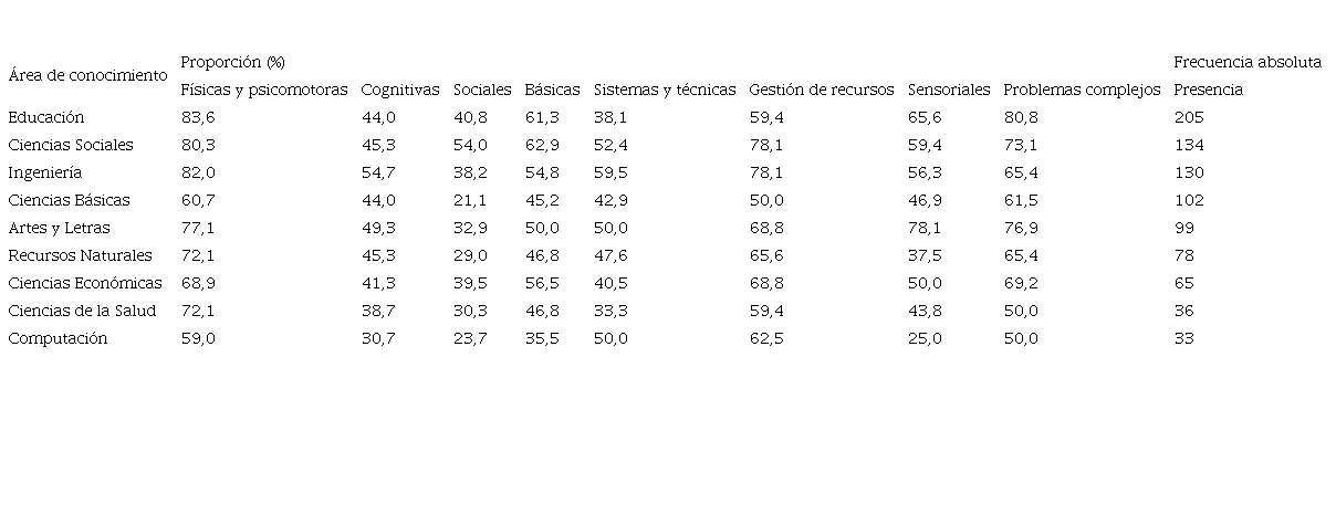 El cálculo de proporción por área de conocimiento, es un indicador adecuado para perfilar las competencias en cada grupo de habilidad, ya que describe dónde existe una mayor o menor presencia en cada uno de ellos. También, se ve reflejada la naturaleza de la composición del área, tal como se evidenció en el área de Educación, que cuenta con mayor presencia en habilidades Físicas y psicomotoras, Problemas complejos y menor proporción en competencias de Sistemas y Técnicas.