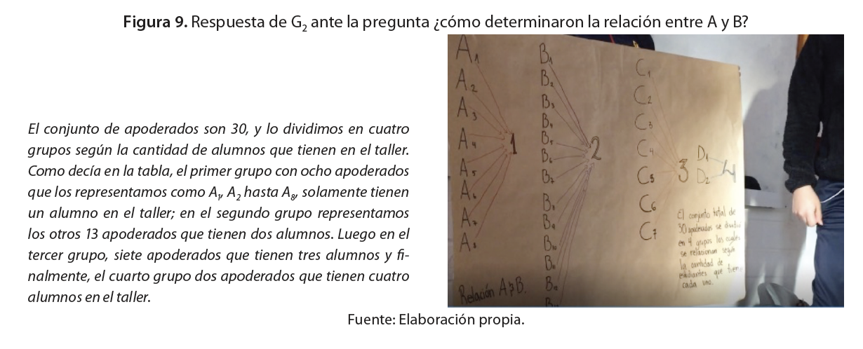 Particularmente sobre la interrogante, ¿cómo determinaron la relación entre A y B?, uno de los integrantes del grupo G2 respondió considerando las representaciones figurales que habían construido, como se ilustra en la Figura 9. Eso da evidencia del papel que juegan las representaciones para justificar y construir las relaciones entre los conjuntos y, a la postre, los conceptos de variable aleatoria y distribución de probabilidad que están detrás de ellas. Esto ratifica las afirmaciones provenientes desde la teoría de TRRS en relación con el uso de estas en la enseñanza de la matemática.