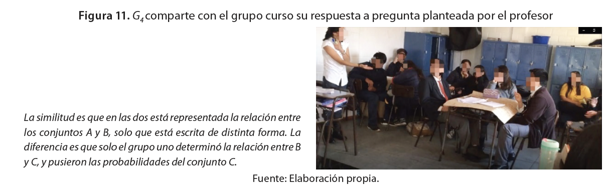 En la presente fase, primero el profesor reconoció que un grupo (G5), no logró dar solución al problema, tres grupos propusieron una respuesta parcialmente correcta (G2, G3 y G4) y uno (G1) respondió completamente bien. Luego, por motivo de duración de la clase, él eligió algunos grupos para exponer y debatir con el curso, la estrategia que utilizaron en la resolución del problema: primer y segundo grupo (G3 y G2) con respuestas incompletas, y un tercero (G1), con respuesta completa correcta. El profesor moderó la discusión del grupo curso, planteando interrogantes a cada uno, con el propósito de evidenciar las estrategias usadas por estos, sus diferencias y similitudes, por ejemplo: ¿Cómo determinaron la(s) relación(es)? ¿Cómo encontraron los elementos del conjunto C? ¿Es posible representar en un solo esquema/dibujo/tabla las dos relaciones? ¿Existe alguna diferencia o similitud entre esta estrategia y la del grupo G1/ G2/ G3?