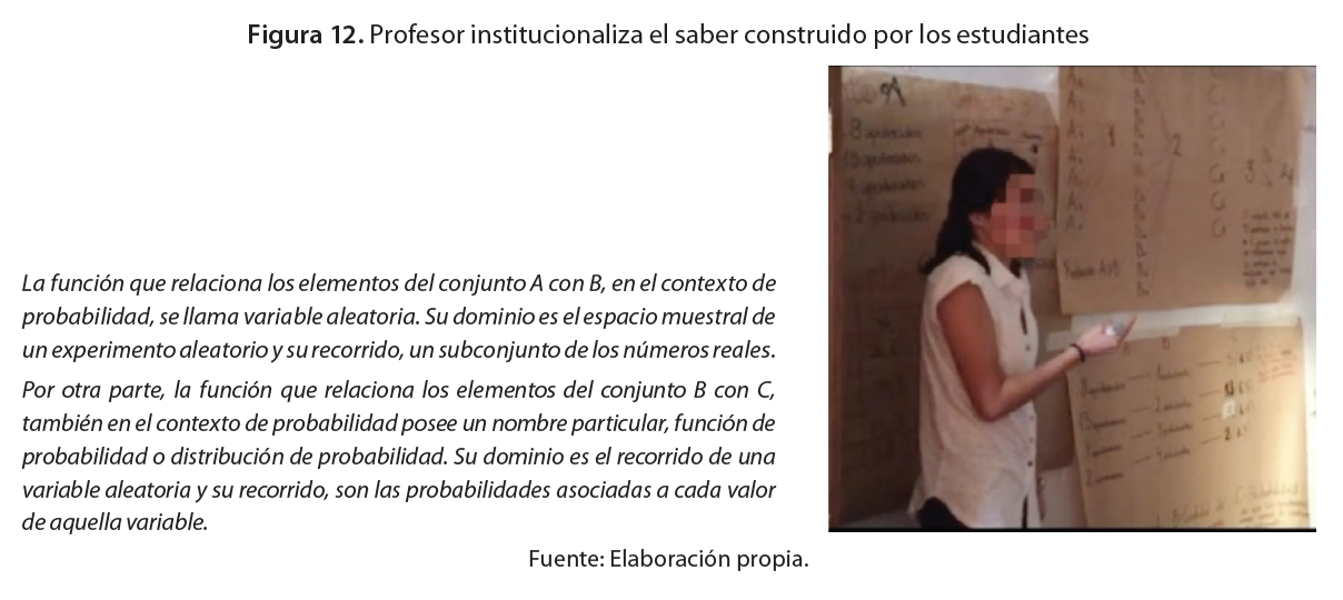 Fuente: Elaboración propia.Así, el profesor formalizó el saber considerando las ideas de los grupos, planteadas en la fase de validación; por un lado, las representaciones usadas por los estudiantes, y por otro, las diferentes respuestas y consensos logrados por ellos, en la fase de validación. Esto pone de relieve el papel que jugaron las teorías didácticas que estuvieron detrás de la clase, tanto desde el conocimiento del profesor como en el diseño de la propuesta de aula y su estructura.