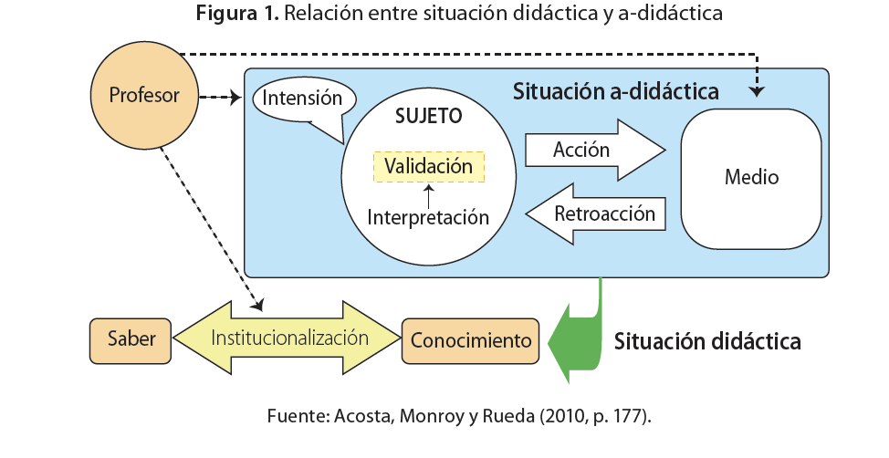 Por un lado, la TSD (Brousseau, 2007) analiza el sistema didáctico integrado por tres elementos: el profesor, el estudiante y el saber, además de sus interacciones centradas en los aspectos cognitivos y epistemológicos de la construcción del conocimiento matemático. En este contexto, una situación es comprendida como “un modelo de interacción entre un sujeto y un medio determinado” (Brousseau, 2007, p. 17), en tanto que, para la realidad de la presente investigación, educación escolar, corresponde al entorno del estudiante, empleado en el proceso de enseñanza-aprendizaje, el cual ha sido creado y manipulado por la persona profesora.