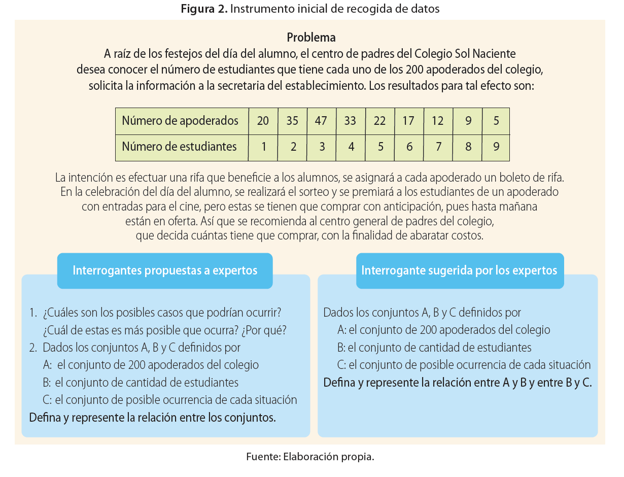 El instrumento utilizado para la recogida de datos, fue un test que contenía un problema (situación didáctica) diseñado por un profesor de matemática que tiene conocimiento de la TSD y la TRRS. El problema, integrado por dos interrogantes (ver Figura 2, izquierda), fue sometido a un proceso de validación de tres expertos en Educación Matemática, doctores en esta área, quienes, en conjunto en una reunión, decidieron que solo la pregunta uno no resolvía este y podía plantearse la dos por sí sola, pero modificada (ver Figura 2, derecha).