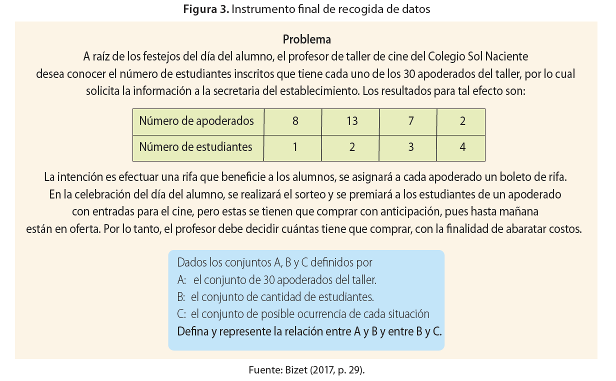 De esta manera fue reformulado el instrumento (Figura 3), obteniendo la versión final del problema, cuyo propósito es tratar los conceptos de variable aleatoria y su distribución de probabilidad a nivel escolar. Para ello, es necesario que el estudiante primero reconozca y represente la relación entre los conjuntos A y B, además de la correspondencia entre los conjuntos B y C. Luego, identifique que las relaciones son funciones y, finalmente, mediante la intervención del profesor, establezca que en el contexto de probabilidad aquellas son denominadas variable aleatoria y distribución de probabilidad respectivamente. Así es introducido el estudio de nuevos conceptos probabilísticos, la variable aleatoria y su vínculo directo con la distribución de probabilidad. La propuesta de aula se diseñó considerando las habilidades propuestas por el Ministerio de Educación de Chile (2016), para los tópicos probabilísticos en cuestión, estas son: organizar, analizar y hacer inferencias acerca de información representada en tabla, elaborar representaciones de acuerdo con las necesidades del problema, y transitar entre los distintos registros de representación de funciones.