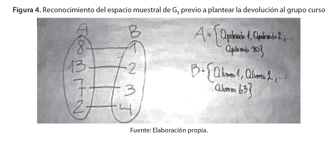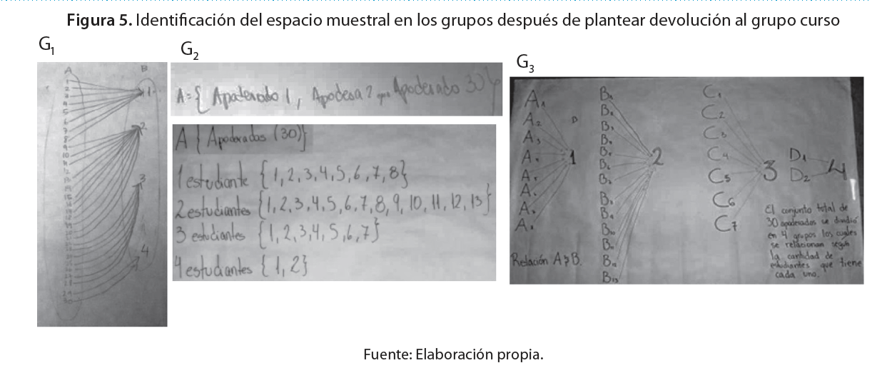 Al comienzo de esta fase, cuatro grupos G1, G2, G3 y G5) reconocieron como espacio muestral un conjunto integrado por la cardinalidad de los cuatro sucesos aleatorios compuestos que lo conforman (cantidad de apoderados, según número de estudiantes matriculado), tal como se muestra en la Figura 4. Así fue evidenciada la identificación y la partición incorrecta del espacio muestral, aquella dificultad también ha sido manifestada en la investigación de Batanero (2001).