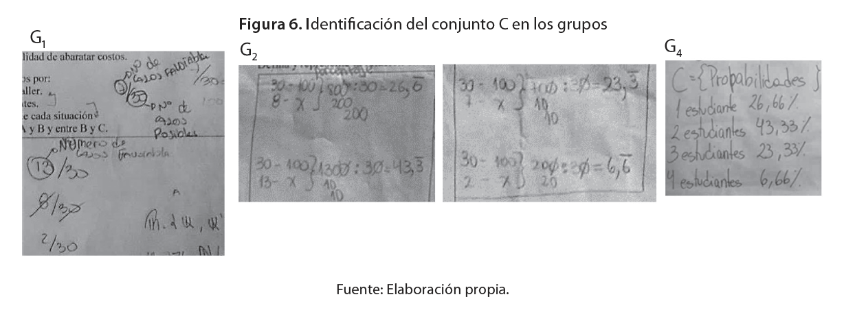También tres grupos (G1, G2, G4) fueron clasificados en la categoría C3, dado que identificaron que el conjunto C está constituido por probabilidades de sucesos compuestos y establecieron sus cuatro elementos. Dos de ellos (G2 y G4) representaron las probabilidades por medio de porcentajes y el otro (G1), como cociente entre el número de casos favorables del suceso y número de casos posibles, como se evidencia en la Figura 6. Aunque uno de los grupos no pudo avanzar satisfactoriamente en esta etapa, los resultados obtenidos sobre determinar la probabilidad de los valores de una variable aleatoria, son más alentadores (59 %) que los señalados por Landín y Salinas (2016). Un factor que pudo ser clave en ello, fue el conocimiento del profesor sobre el uso de representaciones para construir los conceptos (TRRS), y el manejo de buenas preguntas de devolución que hizo (TSD).