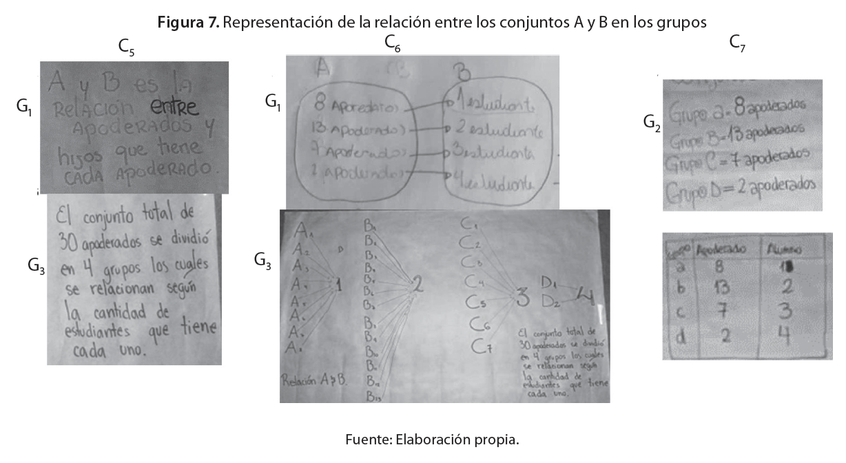 Según es expuesto en la Tabla 4, tres grupos (64%), G1, G2, G3, identificaron en el problema la variable aleatoria, dos de estos G1 y G3) representaron la relación entre los conjuntos A y B en lenguaje verbal (C5) y lenguaje figural (C6), mediante un esquema o diagrama sagital. Además, solo el grupo G2 representó aquella relación por medio de una tabla (C7), como se evidencia en la Figura 7. En tanto que G5, dado que no pudo avanzar en la fase de acción, tampoco logró reconocer tal variable aleatoria. De esta manera, es posible constatar mejores resultados que los obtenidos por Salazar (2014), pues, en general, los estudiantes lograron representar la relación entre el espacio muestral (dominio de la variable aleatoria) y números reales (su recorrido).