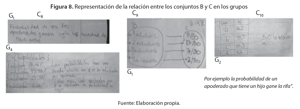 También tres grupos (59 %), G1, G2 y G4, identificaron la distribución de probabilidad asociada a la variable aleatoria, dos de estos (G1 y G4) representaron la relación entre los conjuntos B y C en lenguaje verbal (C8), además G1 representó la relación en lenguaje figural a través de un diagrama sagital (C9) como se aprecia en la Figura 8. La respuesta de G2 (Figura 8, derecha) ha sido clasificada en la categoría C10, debido a que se identifican elementos de la estrategia dos, por ejemplo, una de las columnas de la tabla corresponde a la probabilidad, aunque en ella fue representada la función compuesta entre el espacio muestral y la probabilidad. Mientras que G5 no logró establecer la relación entre los conjuntos B y C. Los resultados logrados sobre determinar la distribución de probabilidad de una variable aleatoria son similares a los obtenidos por Flores et al. (2014).