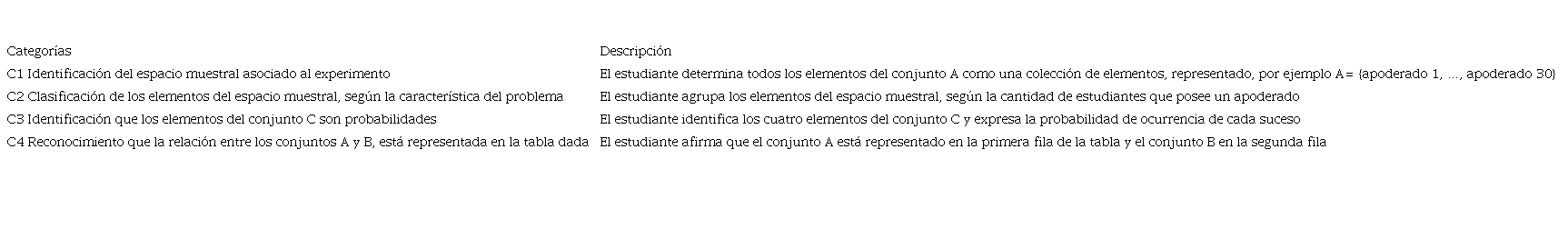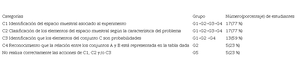 En la primera fase del proceso de instrucción, situación acción, las categorías fueron definidas a partir del reconocimiento de los conceptos que contribuyen a resolver el problema, así se establecieron cuatro: C1, vinculada a los conceptos de experimento aleatorio y espacio muestral; C2, relacionada con la partición de un conjunto y sucesos aleatorios compuestos; C3, asociada a la asignación de probabilidad desde su enfoque clásico/teórico (Regla de Laplace); C4, sobre función, su dominio y recorrido. La Tabla 1 describe cada una de estas.