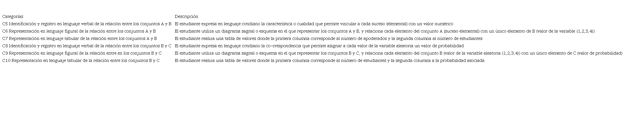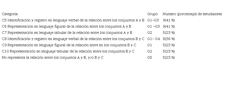 Para la segunda fase del proceso de instrucción, situación de formulación, las categorías han sido establecidas desde la identificación de diversas estrategias de resolución del problema. De esta manera, fueron propuestas tres estrategias que dieron origen a seis categorías de análisis: estrategia 1, representar en lenguaje verbal la relación entre los conjuntos A y B, y B y C, donde emergieron C5 y C8, respectivamente; estrategia 2, representar en lenguaje tabular la relación entre A y B, y B y C, que originaron a C7 y C10, correspondientemente; estrategia 3, representar en lenguaje figural (diagrama sagital o esquema) la relación entre A y B, y B y C, donde surgieron C6 y C9, respectivamente. La descripción de cada categoría es expuesta en la Tabla 2.