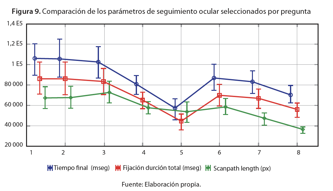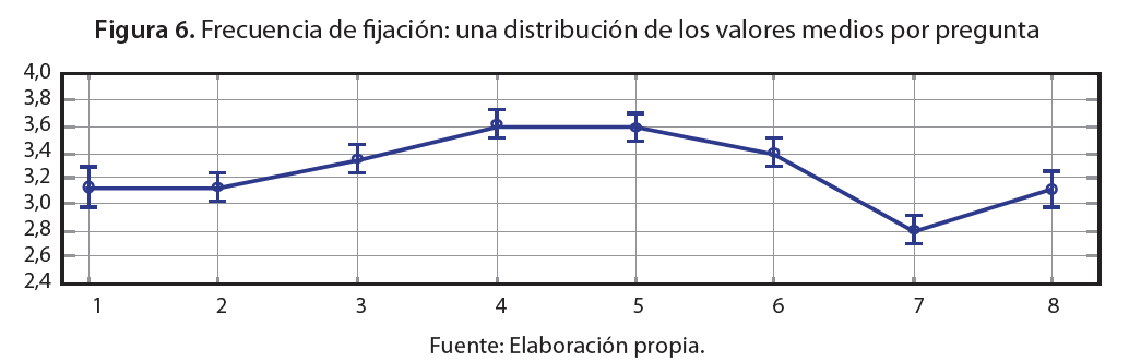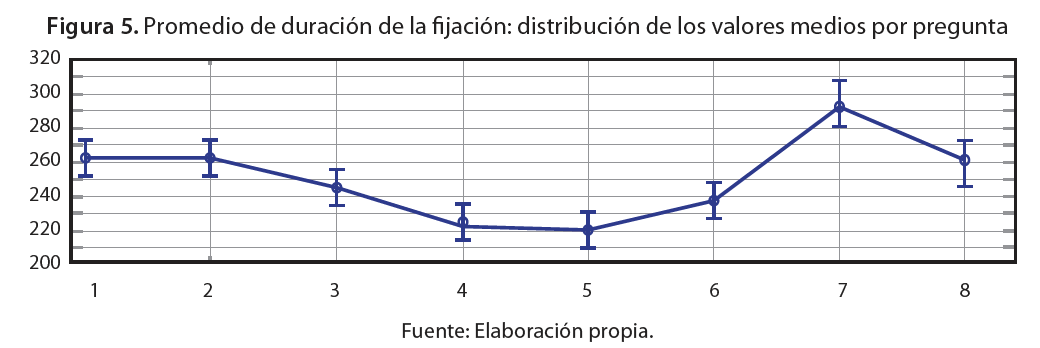 El promedio de duración de la fijación fue significativamente, diferente para algunas preguntas [F (7.364) = 65.043, p <0,001]. El valor más alto de este parámetro, se puede observar en la pregunta n.° 7 (media = 294,13 milisegundos) que se desvía del resto de las preguntas. Este resultado se muestra por la prueba de Scheffé, que es estadísticamente significativa (p <0,001) en este caso. Sin duda, en las respuestas a esta pregunta, se mostró el mayor nivel de procesamiento de los datos oculares registrados (ver Figura 5).