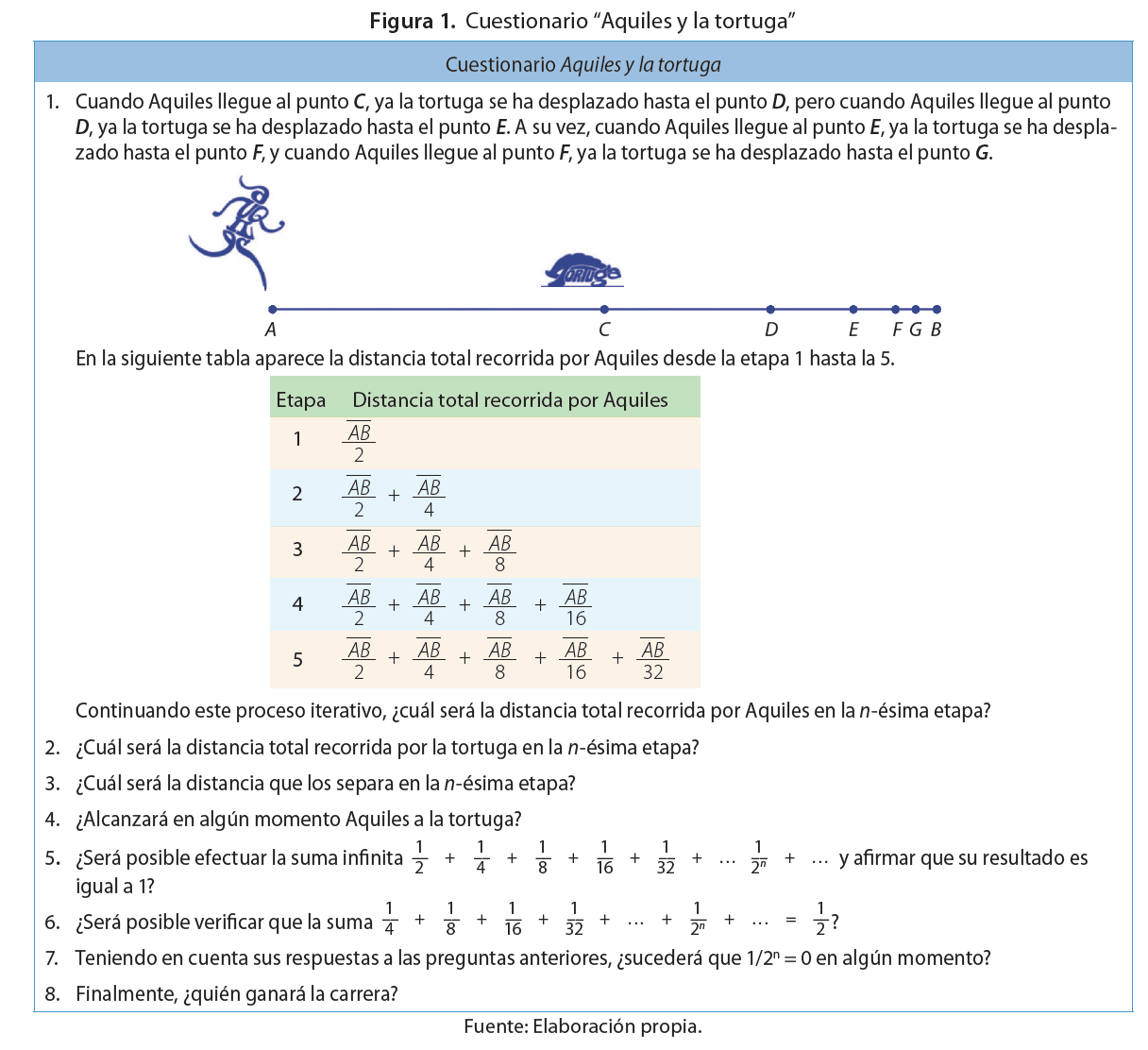 El cuestionario utilizado se muestra en la Figura 1 y se diseñó teniendo en cuenta, estos seis modelos tácitos presentes en el estudio, del infinito matemático según Belmonte y Sierra (2011), y basado en la paradoja de Aquiles y la tortuga de Zenón de Elea en el siglo V a.C. (Bolzano, 1991). Este cuestionario fue analizado en un estudio previo, mostrándose los modelos tácitos adoptados por los estudiantes, en cada una de las preguntas (Díaz-Chang y Arredondo, 2021a). Cada pregunta requirió un análisis del contenido, se evaluó su confiabilidad, consistencia interna y potencial de discriminación. Además, el cuestionario fue validado mediante el pilotaje y la triangulación de contenidos y de expertos, antes de quedar conformado en su versión final para ser utilizado en el experimento. Para conocer detalles de este análisis, ver Díaz-Chang y Arredondo (2021b). Dicho cuestionario fue presentado a los estudiantes, con el siguiente enunciado:
