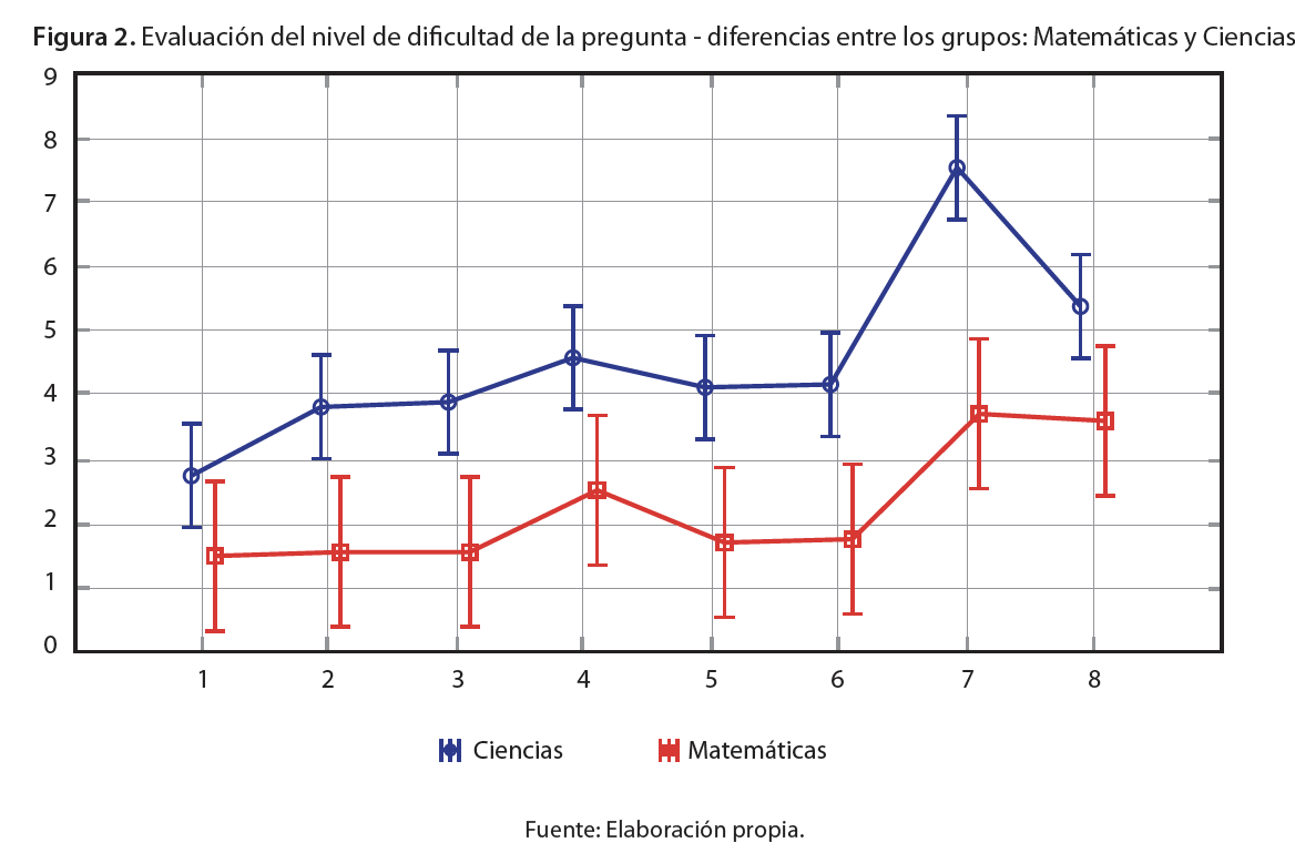 Los resultados se presentan en la Figura 2, donde además se muestran las diferencias entre los dos grupos, que también resultaron ser significativas [F (1,52) = 2,37, p <0,01]. El estudiantado de carreras en Ciencias (media = 4,61), consideró las tareas mucho más difíciles que el estudiantado de Matemáticas (media = 2,29).