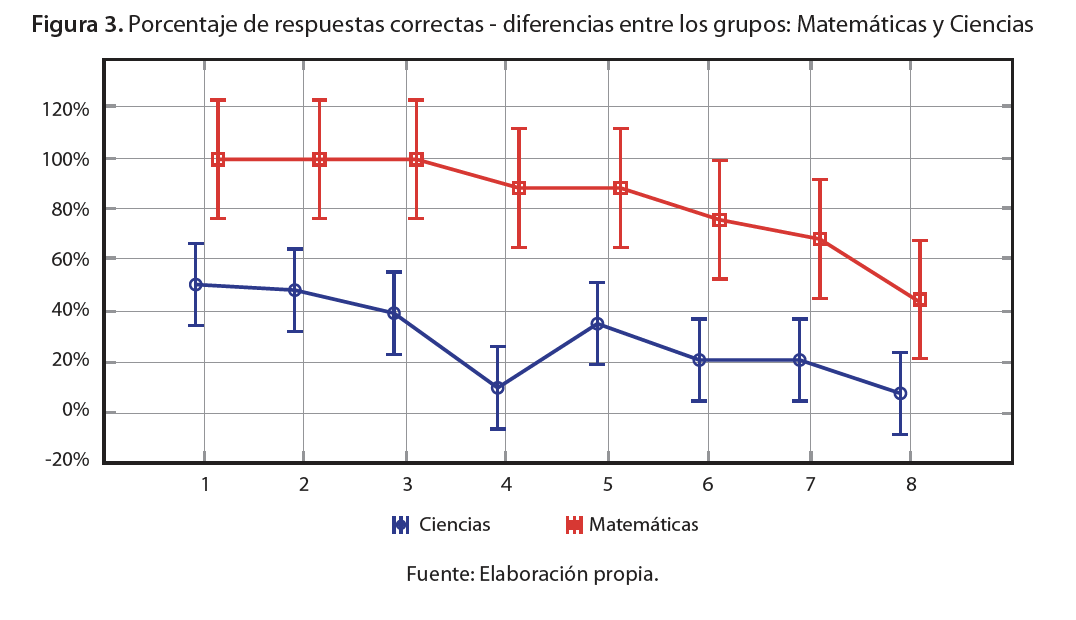 El porcentaje de respuestas correctas en el grupo de las carreras de Ciencias (media = 0,32), fue más de dos veces menor que el del grupo de Matemáticas (media = 0,83). Esta diferencia fue significativa [F (1,52) = 2,72, p <0,01]. Las diferencias entre los grupos se presentan en la Figura 3. Como puede verse, las mayores discrepancias, se observan en las preguntas n.° 3 (media grupo de Ciencias = 0,4, media grupo de Matemáticas = 1,00) y n.° 4 (media grupo de Ciencias = 0,16, media grupo de Matemáticas = 0,89).