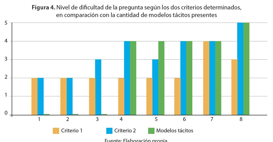 Excepto en el caso de las preguntas n.° 1, n.° 2 y n.° 3 (donde no hay presencia de modelos tácitos) y en el caso de la pregunta n.° 7, se percibe el nivel de dificultad de las preguntas, por debajo del nivel de dificultad indicado por la medición objetiva del porcentaje de respuestas correctas. Este hecho constituye una evidencia de la aparición inconsciente, de estos modelos erróneos de razonamiento.