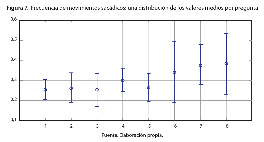 A partir del conteo total de fijaciones y los parámetros anteriores, también se pudo obtener el valor medio del tiempo total de fijación para cada pregunta. Además, se observó el parámetro de la frecuencia de movimientos sacádicos [conteo/segundo] (ver en la Figura 7 la distribución de los valores medios por pregunta). El análisis de varianza mostró diferencias significativas, entre las preguntas en particular [F (7,364) = 3,32, p <0,05].