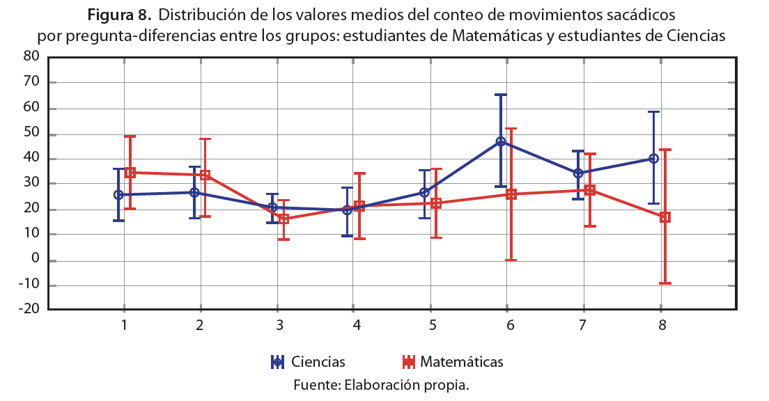 Por último, se observó el conteo total de movimientos sacádicos. En la Figura 8 se muestra la distribución de los valores medios de este parámetro por pregunta, mostrando las diferencias entre ambos grupos. El análisis de varianza mostró que no hubo diferencias significativas ni entre las preguntas en particular, ni entre los grupos de Matemáticas y de Ciencias.