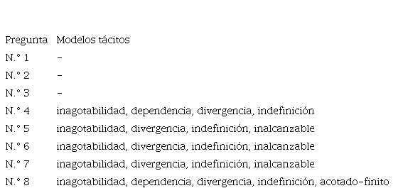 Fuente: Elaboración propia.Según el análisis mencionado y realizado anteriormente, a continuación se muestran (ver Tabla 1) los modelos tácitos en relación con el infinito matemático que se presentaron en el razonamiento de los sujetos, a partir de cada una de las preguntas planteadas.
