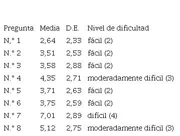 Sobre la base de los valores de estadísticas descriptivas básicas (ver Tabla 3), se puede afirmar que entre las preguntas presentadas, ninguna fue categorizada en las dos categorías extremas: muy fácil o muy difícil. Se categorizó como difícil la pregunta n.° 7 (media = 7,71), moderadamente difícil las preguntas n.° 4 (media = 4,35) y n.° 8 (media = 5,12); y como fáciles, las preguntas n.° 1 (media = 2,64), n.° 2 (media = 3,51), n.° 3 (media = 3,58), n.° 5 (media = 3,71) y la pregunta n.° 6 (media = 3,75).