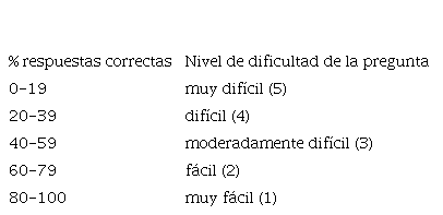 El segundo criterio que se consideró para determinar el nivel de dificultad de las preguntas, fue el porcentaje de respuestas correctas obtenidas (criterio conductual). En la Tabla 4 se muestra la escala de dificultad utilizada.