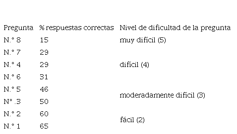 Como se muestra en la Tabla 5, el porcentaje más bajo de respuestas correctas, se obtuvo para la pregunta n.° 8 (15 %), mientras que las preguntas n.° 4 y n.° 7 le siguen en orden (ambas con 29 %). En el grupo de preguntas difíciles, también estaba la n.° 6 (31 %). El mayor porcentaje de respuestas correctas se encontró para la pregunta n.° 1 (65 %) y la pregunta n.° 2 (60 %).