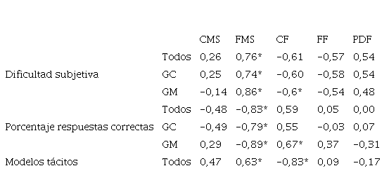 Por otro lado, la correlación entre el valor medio del nivel de dificultad dado y la cantidad de modelos tácitos presente en cada pregunta, también es fuerte (r = 0,61) y significativa (p <0,025). El porcentaje de respuestas correctas proporcionadas y la cantidad de estos modelos presente en cada pregunta, están fuertemente correlacionados (r = -0,89) y es significativa (p <0,025). Como ya hemos mencionado, el hecho de que el índice de correlación sea negativo, significa que cuanto mayor sea el número de modelos tácitos que aparecen asociados a una pregunta, menor es el porcentaje de respuestas correctas que se obtiene.