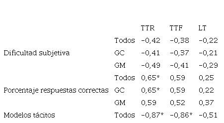 Se determinó si existían correlaciones entre la evaluación del nivel de dificultad de la pregunta (criterio 1), el porcentaje de respuestas correctas obtenidas (criterio 2), la presencia de modelos tácitos y los parámetros discutidos anteriormente (frecuencia y conteo de movimientos sacádicos y frecuencia, duración promedio y conteo de fijaciones).
