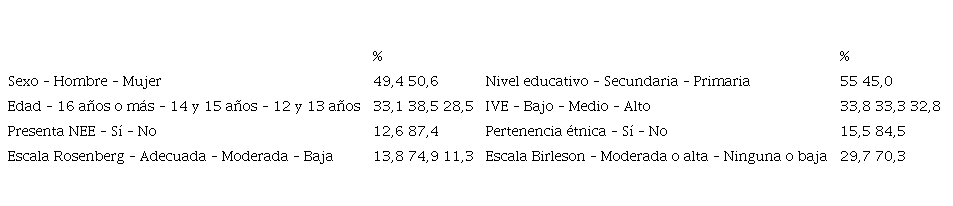En cuanto a las características de la muestra (Tabla 1), encontramos una homogeneidad en términos de género y un leve predominio de estudiantes de enseñanza media (55%) y adolescentes entre 14 y 15 años (38,5%). En cuanto a los niveles de representación étnica y de estudiantes con Necesidades Educativas Especiales, alcanzan el 15,5% y 12,6%, respectivamente.