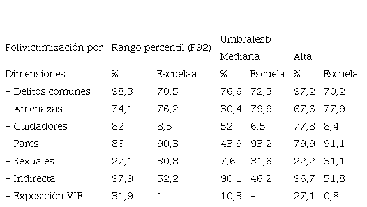 Asumiendo que la polivictimización es un constructo complejo, la Tabla 2 proporciona dos criterios para su medición: rango percentil (P92) y umbrales. Ambos perfiles fueron construidos sobre la base de aquellas victimizaciones que pudieran haber ocurrido en la escuela durante los últimos doce meses (véase Procedimiento). Según el criterio de percentiles (P92), las polivíctimas se encontrarían principalmente expuestas a victimización por delitos comunes (98,3%), eventos indirectos (97,9%), pares (86,0%), cuidadores (82,0%) y amenazas (74,5%), hechos que implican riesgo tanto corporal como psicológico. Estas dimensiones manifiestan prevalencias mayoritariamente sobre el 70%, con excepción de cuidadores (8,5%), cuyos indicadores están dirigidos principalmente al contexto familiar.