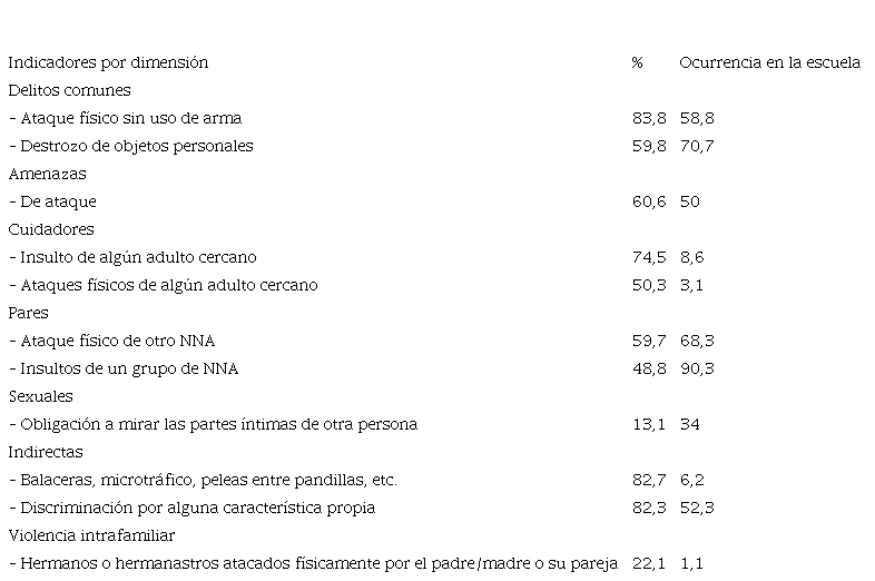 Debido a esta similitud entre P92 y polivictimización de alta intensidad, la Tabla 3 considera solamente al primer perfil en la indagación de aquellos indicadores o situaciones que representarían la cotidianidad para algunos NNA, especialmente en la escuela. En términos específicos, y siguiendo las cifras de mayor prevalencia, la polivictimización sería el reflejo de vivencias como ataque físico sin uso de armas (83,8%), atestiguamiento de balaceras, microtráfico, peleas entre pandillas (82,7%) o discriminación por alguna característica propia (82,3%), recibir insultos por parte de algún adulto cercano (74,5%) y encontrarse expuesto a amenazas de ataque físico (60,6%), situaciones que implican violencia física, verbal y simbólica en magnitudes preocupantes.