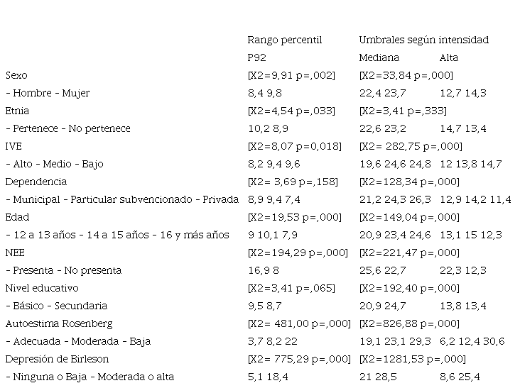 En el afán de indagar entre quienes estuvieron más expuestos a polivictimización, dónde se acentúa y qué rostro adquiere, la Tabla 4 presenta una caracterización de ambos perfiles, P92 y umbrales, de acuerdo con las variables teóricamente más relevantes que incluye la encuesta. A nivel general, observamos que la polivictimización por percentiles (P92) tiene una manifestación moderada entre variables sociodemográficas, siendo más intensa su relación con características psicológicas. Por el nivel de exigencia de P92, era de esperar que mostrara valores acotados en la muestra, y aunque los contrastes de chi cuadrado resultaron significativos en casi todas las variables incluidas, la polivictimización entre NNA alcanzó mayoritariamente cifras cercanas al 10% de prevalencia, sea por género, etnia, índices de vulnerabilidad escolar (IVE), dependencia del colegio, edad o nivel educativo.