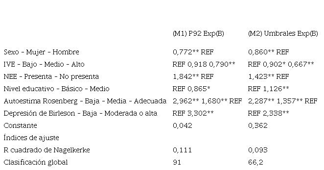 En el caso del modelo de regresión por umbrales (M2), se dicotomizó el perfil entre quienes presentaban baja o nula victimización (3 o menos) y aquellos con mediana o alta polivictimización (4 y más). Este modelo resulta similar al M1, de hecho, se mantienen tanto la orientación como la jerarquía de las variables independientes, con excepción de cursar enseñanza media, que ahora resulta un factor de exposición a polivictimización (Exp(B)= 1,126; p<,01). Las probabilidades vinculadas con depresión, autoestima y NEE disminuyen ligeramente, pero siguen siendo factores que incrementan notoriamente la exposición a violencia y victimización.