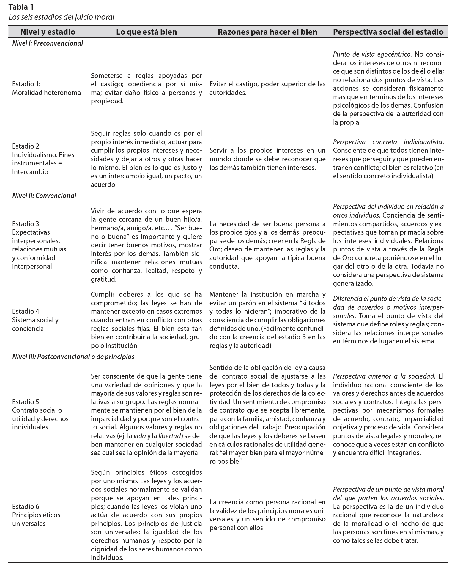 En otras palabras, Kohlberg (1963) acepta la teoría del desarrollo cognitivo y la del desarrollo moral de Piaget, pero en cuanto a este último aspecto, extiende su estudio a niños(as) mayores de doce años y especifica con mayor detalle estadios de juicio moral más avanzados. En la tabla 1, se pueden evidenciar los niveles y estadios que Kohlberg (1976) planteó para determinar el desarrollo moral de las personas.
