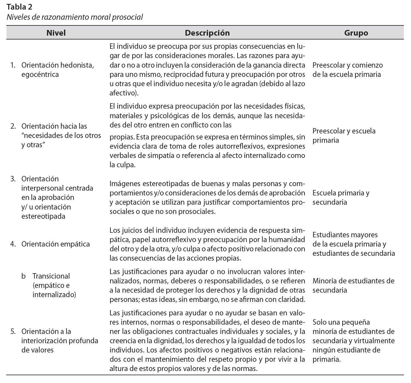 En la tabla 2 se pueden observar los niveles de razonamiento prosocial para determinar el desarrollo moral de las personas. Los niveles se sugieren como una estructura jerárquica, en la que cada etapa involucra estructuras cognitivas más avanzadas de conceptos sociales que las de etapas anteriores. Sin embargo, debido a falta de datos, no se puede afirmar la universalidad ni la invariabilidad de la secuencia con respecto a la posibilidad de saltar etapas (Eisenberg, Lennon y Roth, 1983). Esto último también representa una diferencia con respecto a lo que plantea Kohlberg sobre la universalidad y la invariabilidad de la secuencia (Hersh, et al. 1998), así como la diferencia que existe entre esta clasificación de niveles y la de los estadios de Kohlberg (1976), puesto que el desarrollo del juicio moral prosocial no es idéntico al desarrollo del juicio moral orientado a la prohibición. Esta diferencia conceptual resulta oportuna porque abre espacio a lo diverso en el proceso de desarrollo, influenciado por lo social, lo cultural y la reflexión que puedan generar en conjunto las personas estudiantes.