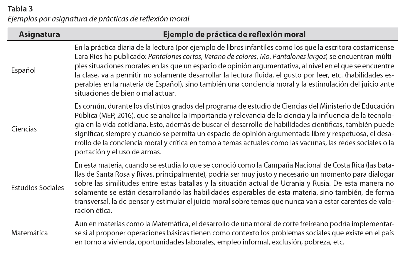 En la tabla 3 se organizan algunos ejemplos en los que puede ponerse en práctica la reflexión moral durante las clases de distintas asignaturas.
