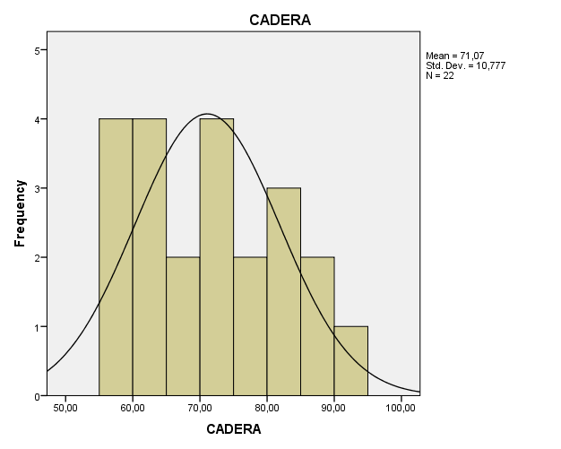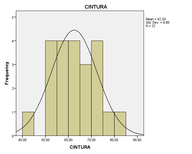 Se puede observar que con respecto a los deportistas valorados el rango que contiene la mayor cantidad es de 50,00 a 65,00 y de 70,00 a 75,00 con un total de 4 deportistas en cada uno de estos. Le sigue el rango de 65,00 a 70,00 con un total de 3 deportistas. Mientras que la menor cantidad de deportistas se puede encontrar en los rangos de 40,00 a 45,00 y de 75,00 a 85,00 con un total de 1 deportista en cada uno de éstos. Por lo tanto, se puede apreciar que de un total de 22 deportistas valorados se presenta una media de 62,50 y una desviación estándar de 9,86 con respecto a la variable medida (CINTURA).