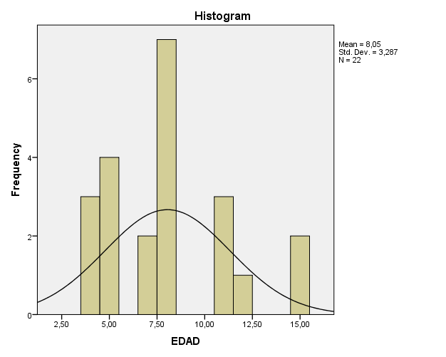 En la gráfica se puede apreciar apreciar la frecuencia de edad en el que se encuentran los deportistas valorados (22) que va de los 3 a los 15 años. Se observa que el rango más elevado se encuentra en las edades de 7 a 8 años con 8 deportistas. También se puede apreciar que en las edades de 7 y 15 años se encuentran 2 deportistas en cada una de éstas. Mientras que en el rango de 12 años se encuentra la menor cantidad de deportistas con un total de 1. Por tanto, se puede apreciar que de un total de 22 deportistas valorados se presenta una media de 8,05 y una desviación estándar de 3,287 con respecto a la variable medida (edad).