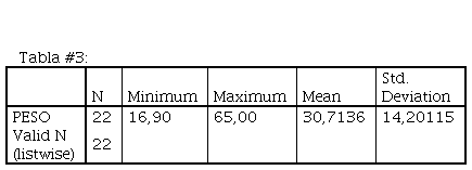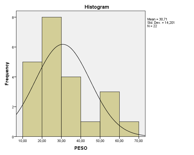 En la gráfica #4 se puede observar la frecuencia en la que se encuentran los deportistas valorados (22) con respecto al peso; el cual presenta un rango que va de 10 kg a 70 kg. Se observa que en el rango de 20 a 30 kg se encuentra el mayor número de deportistas con un total de 8, mientras que en los rangos de 10 a 200 kg se encuentran 5 deportistas y 30 a 40 kg se encuentra un total de 4 deportistas en 3l rango de 50 a 60 kg un total de 3 deportistas. Mientras que en el rango de 40 a 50 kg y 60 a 70 kg se encuentran la menor cantidad de deportistas con un total de 1 en cada uno de éstos. Por tanto, se puede apreciar que de un total de 22 deportistas valorados se presenta una media de 30,71 y una desviación estándar de 14,201 con respecto a la variable medida (peso).