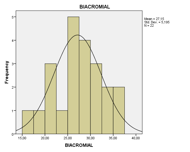 En la gráfica #5 se puede observar la frecuencia en la que se encuentran los deportistas valorados (22) con respecto a la medida del perímetro Biacromial; la cual presenta un rango que va de 25,00 a 30,00mm. Se puede observar que con respecto a los deportistas valorados la mayor cantidad se encuentra en el rango de 25,00 mm con un total de 5 deportistas. En el rango que va de 27,50 a 30,00mm se encuentra un total de 4 deportistas. También, se puede ver que, en el rango de 20,00 mm y 30,00mm se encuentran un total de 3 deportistas. Y se observa que en el rango de 32,50 a 37,00 mm se encuentran 2 deportistas. Mientras que en los rangos con menor cantidad de deportistas son de 15,00 mm a 20,00 mm y 22,50 mm a 25,00mm con un total de 1 deportista en cada uno de éstos. Por tanto, se puede apreciar que de un total de 22 deportistas valorados se presenta una media de 27,15 y una desviación estándar de 5,195 con respecto a la variable medida (BIACROMIAL).
