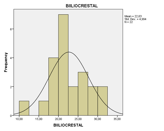 En la tabla #5 podemos observar la frecuencia en la que se encuentran los deportistas valorados (22) con respecto a la medida del perímetro Biliocrestal; la cual presenta un rango que va de 10,00 a 32,50mm. Se puede apreciar que, con respecto a los deportistas valorados, la mayor cantidad se encuentra en los rangos que van de 20,00 a 22,50mm con un total de 7 deportistas; entre 17,51 a 20,00 con un total de 4 deportistas. Y de 25,00 a 27,50 se encuentran 3 deportistas. Mientras que los rangos de 22,51 a 25,00mm; 27,51 a 32,50mm y 35,00 a 40,00mm presentan solo 2 deportistas. Y en los rangos de 10,00 a 12,50mm y 15,00 a 17.50mm con un total de 1 en cada uno de éstos. Por tanto, se puede apreciar que de un total de 22 deportistas valorados se presenta una media de 22,63 y una desviación estándar de 4,994 con respecto a la variable medida (BILIOCRESTAL).