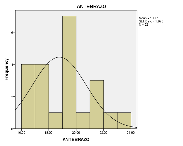 En la gráfica #7 se puede observar la frecuencia en la que se encuentran los deportistas valorados (22) con respecto a la medida del diámetro del antebrazo; el cual presenta un rango que va de 16,00 a 24,00 Se puede observar que con respecto a los deportistas valorados el rango que contiene la mayor cantidad es de 19,00 a 20,00 con un total de 7 deportistas. El rango de 16,00 a 18,00 con un total de 4 deportistas. El rango de 21,00 a 22,00 con un total de 3 deportistas, mientras que la menor cantidad de deportistas se encuentran en los rangos de 18,00 a 19,00, de 20,00 a 21,00 y de 22,00 a 24,00 con un total de 1 deportista en cada uno de éstos. Por lo tanto, se puede apreciar que de un total de 22 deportistas valorados se presenta una media de 18,77 y una desviación estándar de 1,973 con respecto a la variable medida (ANTEBRAZO).