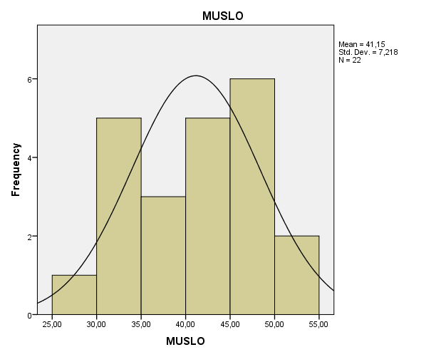 Le sigue el rango de 30,00 a 35,00 y de 40,00 a 45,00 con un total de 5 deportistas en cada uno de estos. Siguiéndole el rango de 35,10 a 40,00 con 3 deportistas. Y después el de 50,00 a 55,00 con 2 deportistas. Mientras que la menor cantidad de deportistas se puede encontrar en los rangos de 25,00 a 30,00 con un total de 1 deportista. Por lo tanto, se puede apreciar que de un total de 22 deportistas valorados se presenta una media de 41,15 y una desviación estándar de 7,218 con respecto a la variable medida (MUSLO)